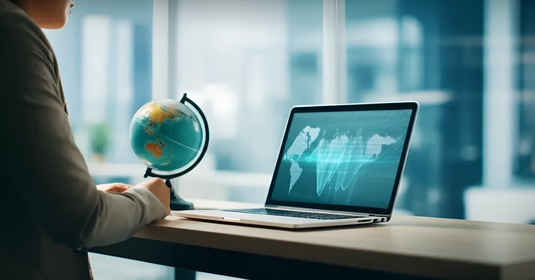 A person at a desk with a laptop, looking at a globe, symbolizing foreign property ownership and international tax considerations.